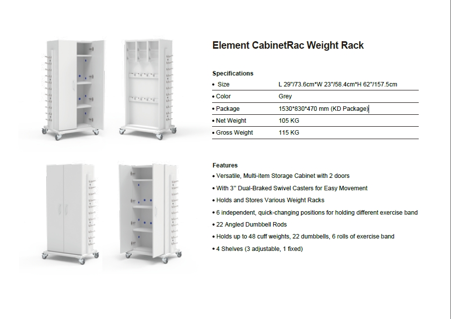 The Element Series CabinetRac Weight Rack is a versatile multi-purpose storage device designed to hold up to 48 cuff weights, 22 dumbbells, 6 rolls of exercise band and/or tubing and much more. It is an ideal choice for any physical therapy or rehabilitation facility.