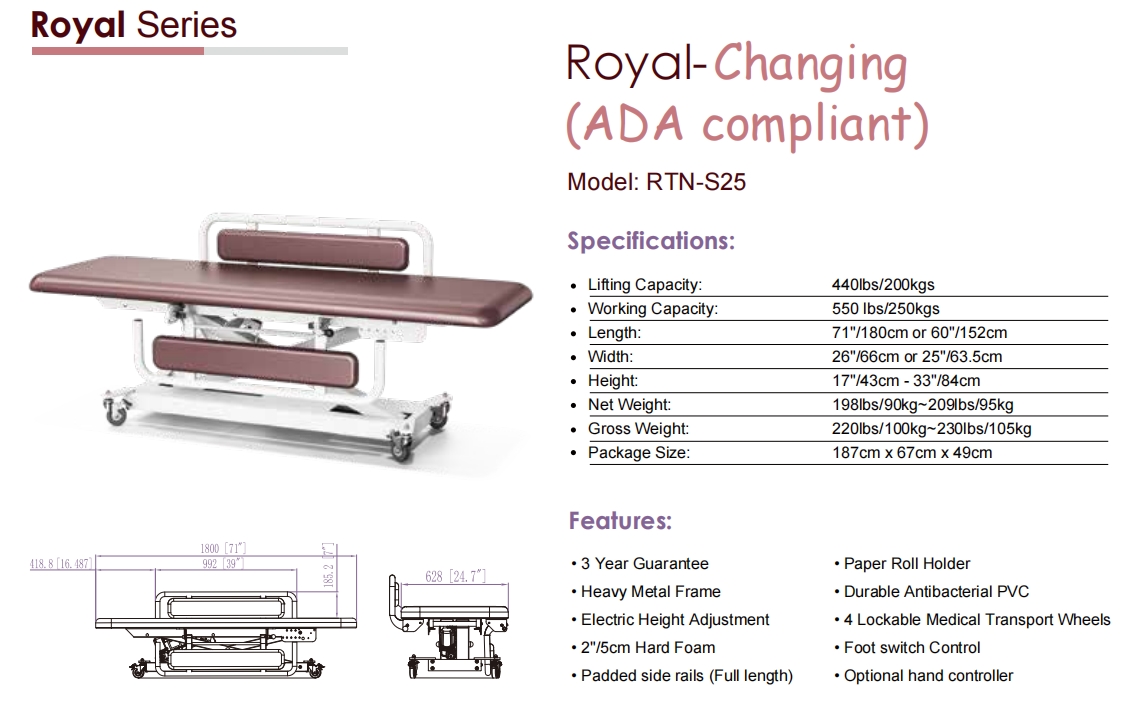 Royal Electric Hi-Lo Changing Table with Antimicrobial upholstery is a stable treatment table with side protection for added patient safety. With its heavy-duty construction and premium materials, this table delivers optimal functionality perfect for any