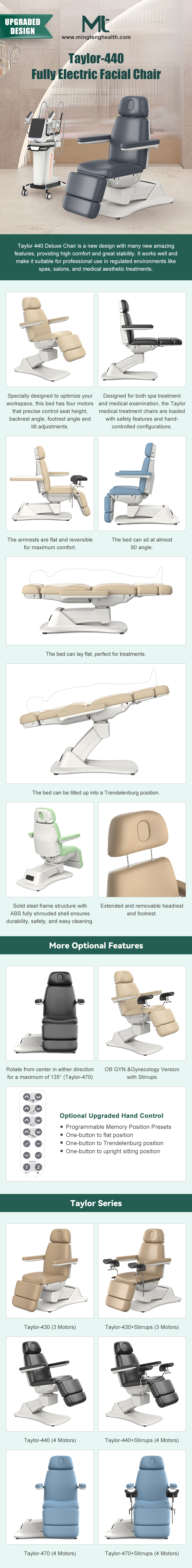 Elevate your practice with the Taylor 440, the ultimate 4 motor electric treatment chair designed for esthetic procedures, pre- or post-op evaluations, outpatient surgeries, and fat-reduction treatments. Engineered with enhanced features and ergonomic des